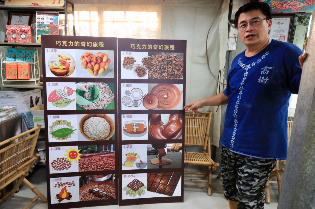 屏東種可可的地方,大多是早年種檳榔的地方。當年檳榔綠金崩盤,農民為了生存要找新作物,發現檳榔樹有遮陰與調節溫濕度效果,能營造類似熱帶雨林的環境,當年的「綠金」於是搖身一變成為孕育咖啡與可可等「黑金」植物的保姆。很多屏東可可都種在客家庄內的檳榔樹下,因此早年輔導可可農民最主力其實是屏東縣政府客家事務處,還有內埔鄉文化促進會總幹事黃琬倫,之後又有屏科大、美和科大等學術及農政單位加入,他們找專家從種植、發酵、調溫、品牌經營一點一點手把手教農民,也因此台灣優質巧克力不像國外都是食品大廠,而大多是小農或私人自有品牌,他們一路跌跌撞撞,從什麼都不懂的鄉下農民變成國際巧克力賽事常勝軍,自己種自己發酵自己賣,成為像法國酒莊一樣從Tree to Bar的可可莊園,包含福灣、喜樂可可、阿信、可茵山、邱氏、牛角灣、小雨果….,台灣可可莊園遍地開花,短短幾年不停在國際上獲獎,這過程其實很傳奇,很電影。
